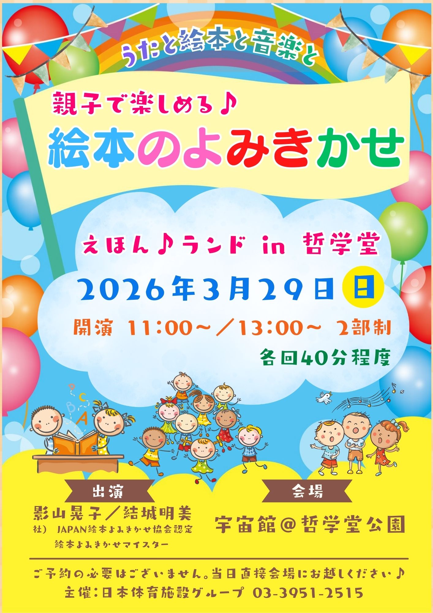 絵本読みきかせマイスターである歌のお姉さんとお話のお姉さんのふたりで絵本の読み聞かせをしたり、音楽に合わせて一緒に手遊びを行います♬