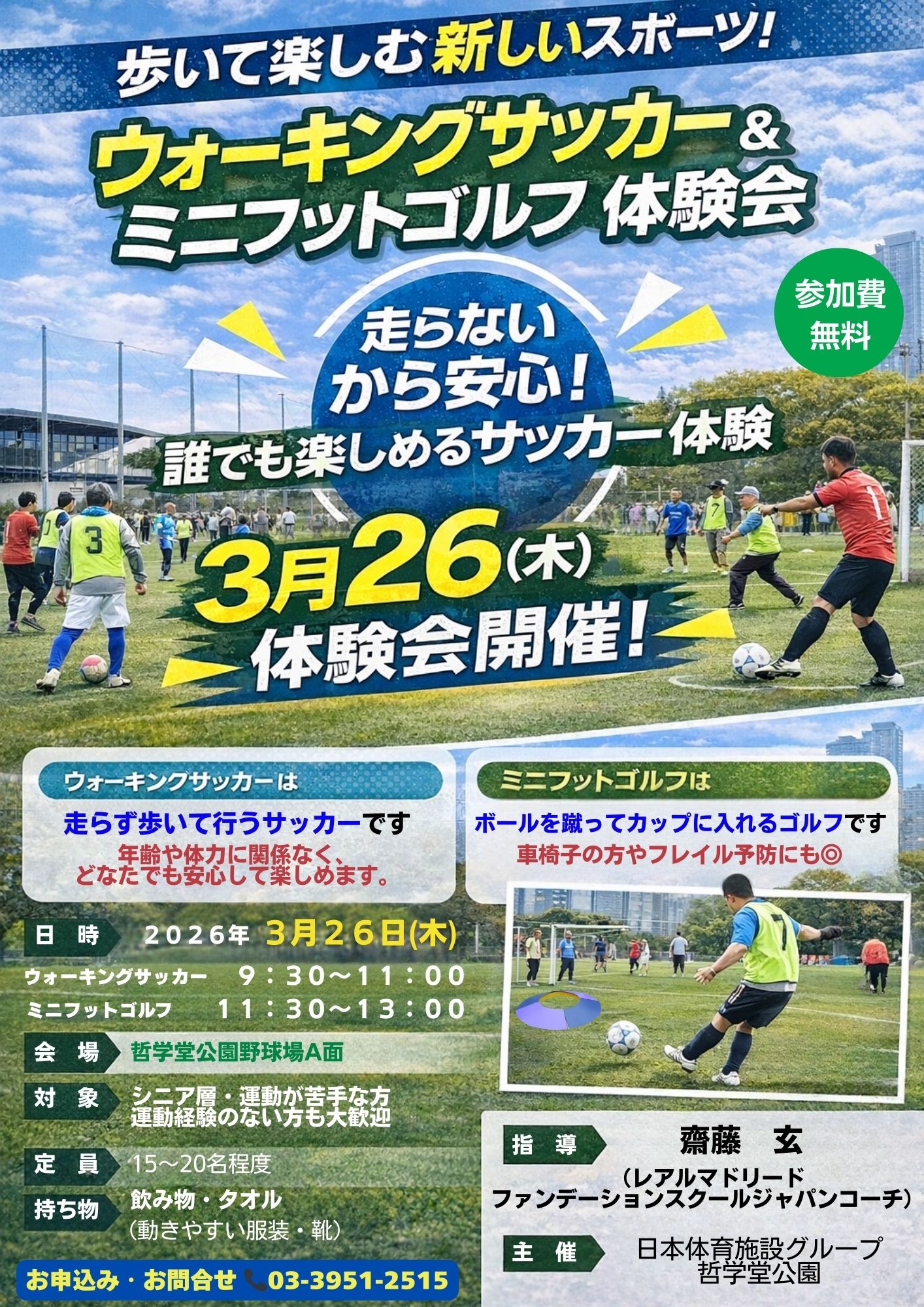 | 時 間 | 【ウォーキングサッカー】9:30~11:00 【ミニフットゴルフ】11:30~13:00 |