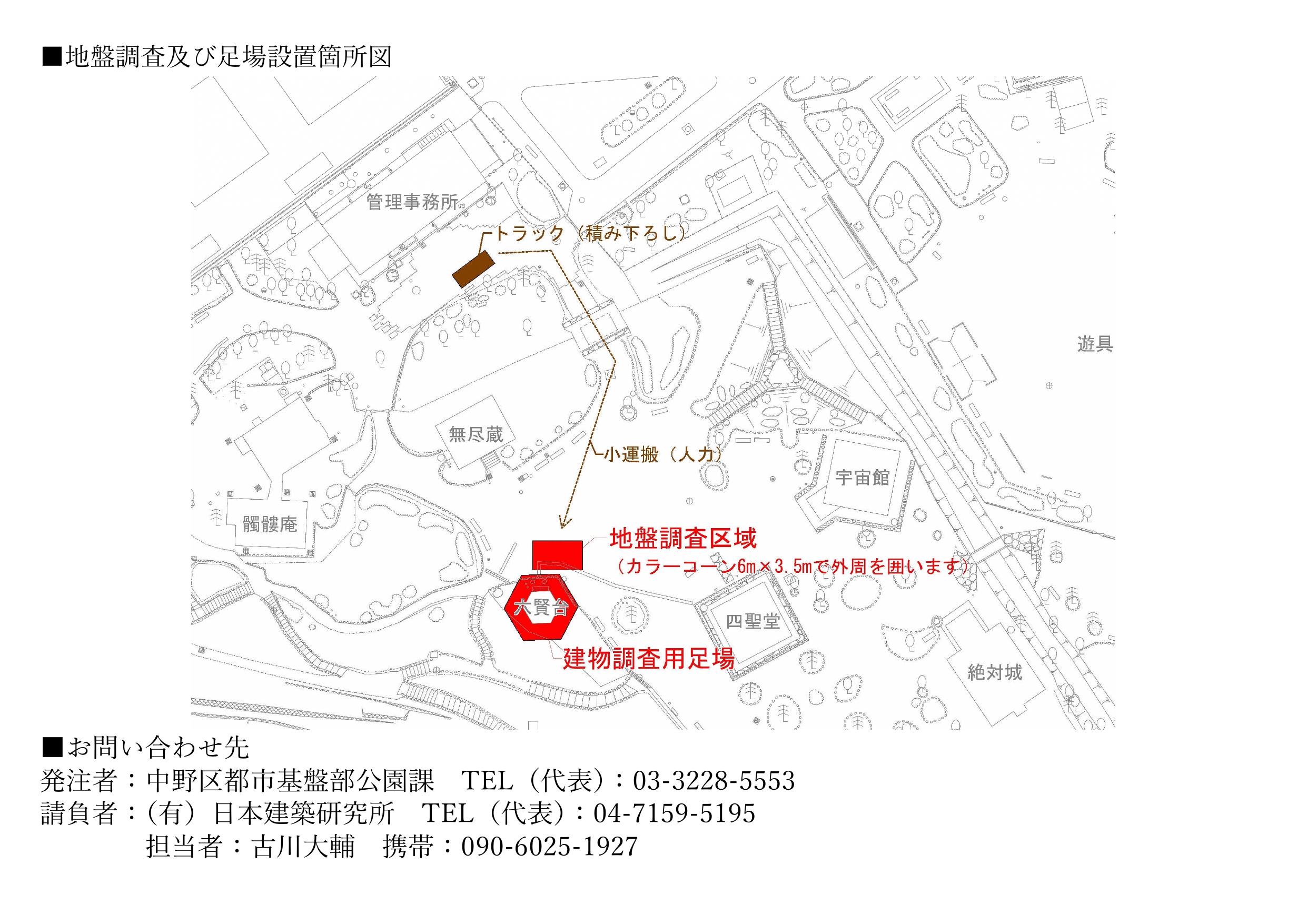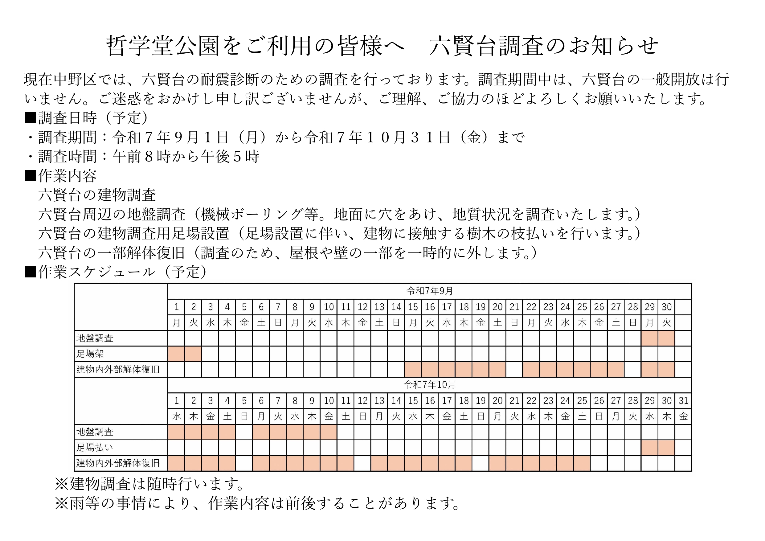 いつも哲学堂公園ならびに運動施設をご利用いただきまして誠にありがとうございます。 下記日程におきまして、六賢台の耐震診断のための調査を実施いたします。 調査期間中は、六賢台の一般開放は行いません。