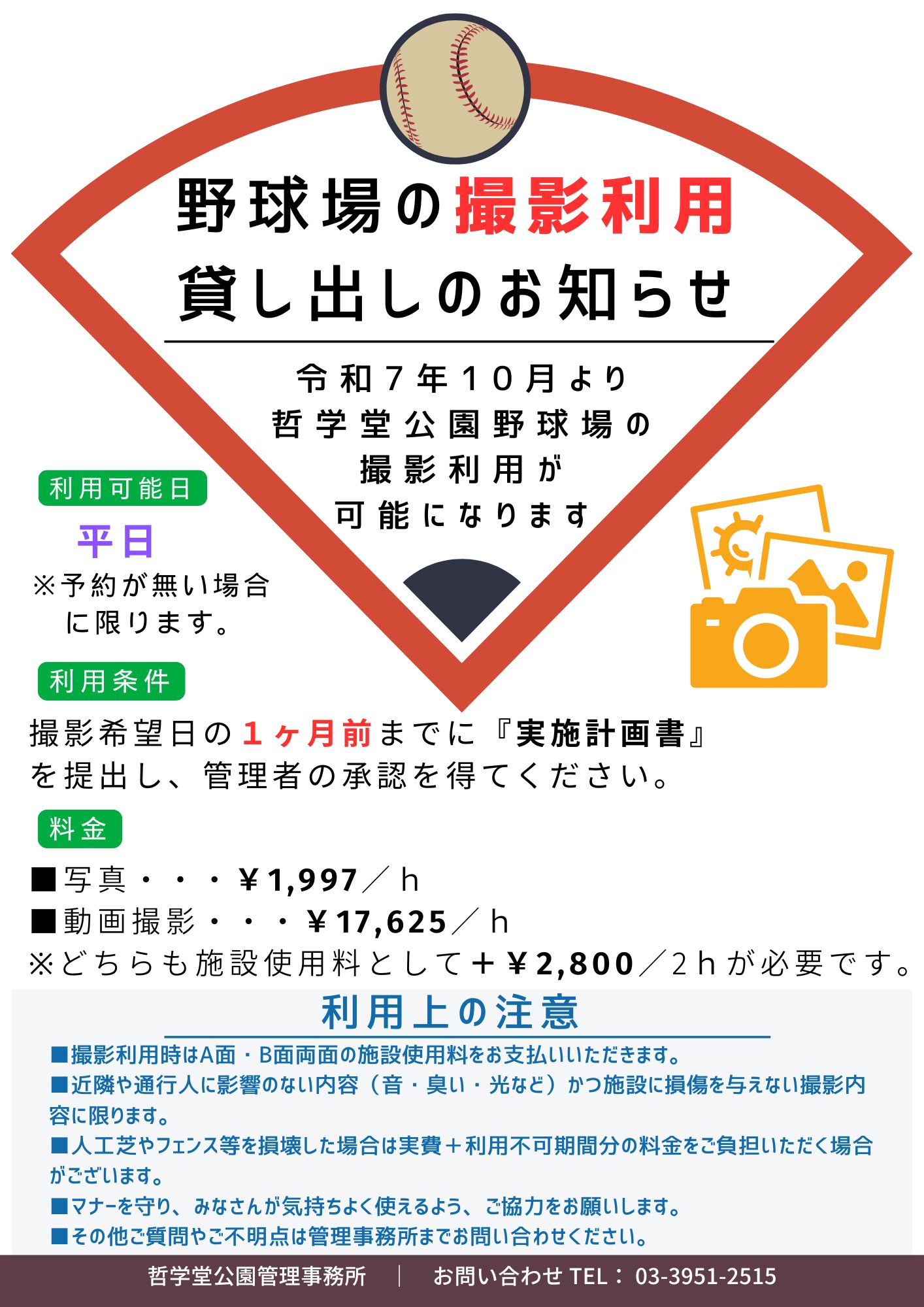 10月より野球場における撮影利用の貸し出しを開始いたします。