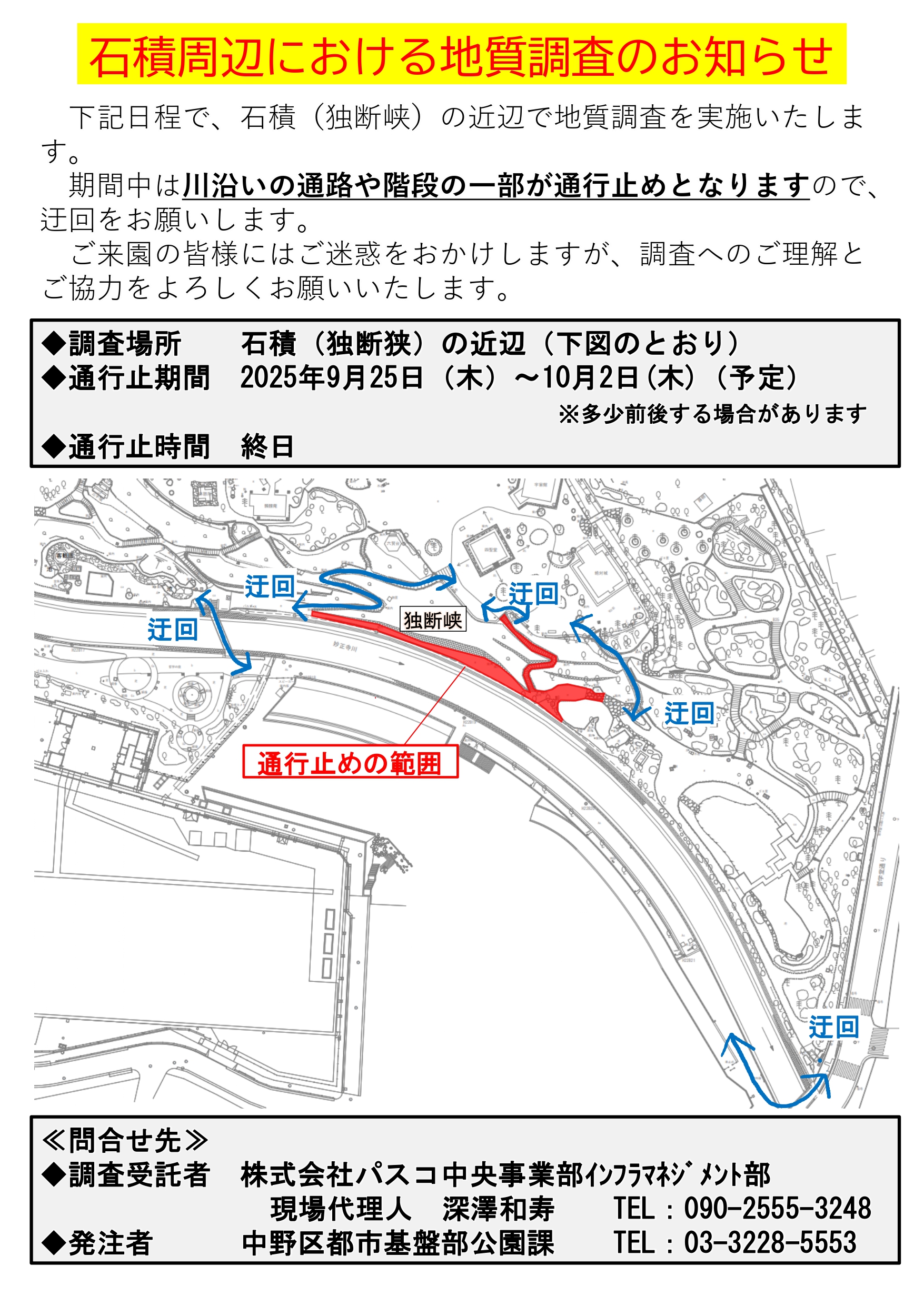いつも哲学堂公園ならびに運動施設をご利用いただきまして誠にありがとうございます。 下記日程におきまして、石積周辺における地質調査を実施いたします。 期間中は、調査区域の通行ができないため下記迂回ルートのご利用をお願いいたします。