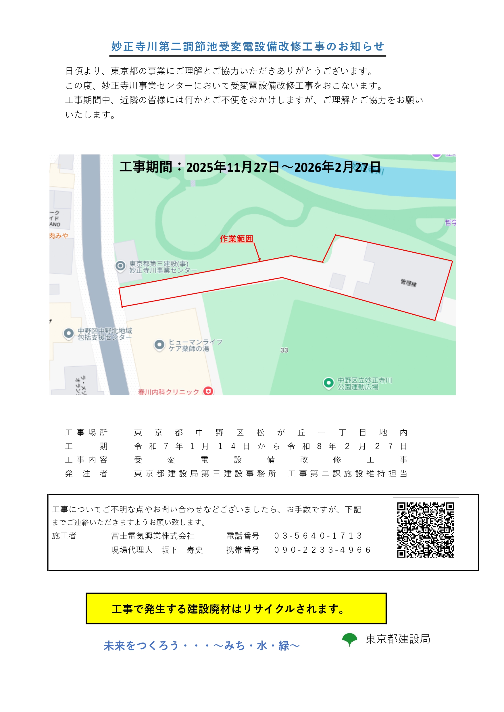 いつも哲学堂公園ならびに運動施設をご利用いただきまして誠にありがとうございます。 下記日程におきまして、妙正寺川事業センターにおいて受変電設備改修工事をおこないます。